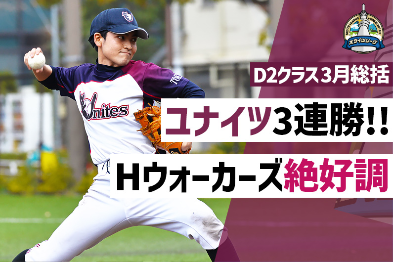 グッと暖かくなり桜が咲き始めた3月、MIAYBI、IKIのD2クラスは各チームが積極的に始動している。このクラスは新規参加チームの活躍が目立ち、光が丘Walkers は打撃好調で2勝1分、広島国際カープ は逃げ切りで開幕戦勝利、ユナイツ は3月に2連勝し2月から3連勝となり首位をキープしている。
